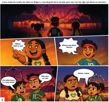 ¡Miren! ¿Qué es eso? ¡Parece una feria! ¡Vamos! Bueno, vamos Sólo será un rato ¿No deberíamos ir a casa antes? 5