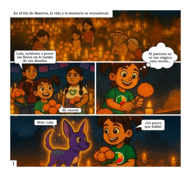 En el Día de Muertos, la vida y la memoria se encuentran. Lula, ayúdame a poner El panteón se las flores en la tumba ve tan mágico de tus abuelos. esta noche… ¡Sí, mamá! Hola, Lula. ¿Un perro que habla? 1